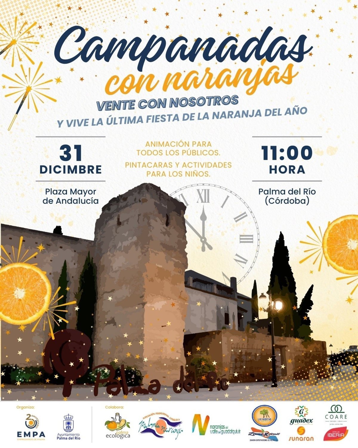 Durante el evento, se ofrecerán naranjas para todos los asistentes, gracias a la colaboración de las asociaciones Palmacorta, PalmaEcológica y Naranjas del Valle del Guadalquivir, así como de empresas como Las Huertas, Zamexfruit, Guadex, Sunaran, Coare y Cítricos Iberia que han donado el producto. Además, habrá actividades de animación, baile de Salsa Quimbara, pintacaras, globoflexia, colchoneta hinchable, música, sorteos y mucha diversión para disfrutar del último día del año.